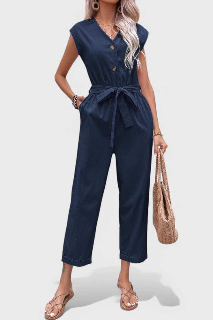 Suelto y sin esfuerzo, Marie es tu opción ideal para los días cálidos que requieren comodidad y facilidad. Con su corte hasta el tobillo, cintura ajustable con lazo y suave tela de mezcla de algodón, este mono sin mangas combina un encanto relajado con un diseño pensado. Perfecto para paseos, brunches o cualquier plan en un día soleado.