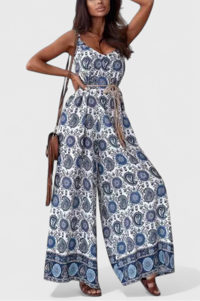 Haz una entrada impactante con Gabriella: un mono fluido de pierna ancha diseñado para captar la atención. Con su favorecedor escote en V, delicados tirantes de espagueti y cinturón que define la cintura, este look combina un estampado audaz con una sofisticación sin esfuerzo. Ideal para escapadas soleadas o planes nocturnos elegantes.